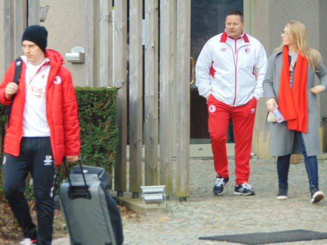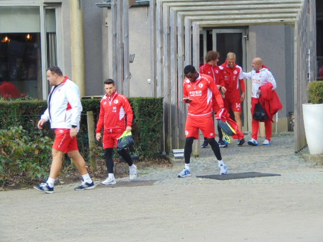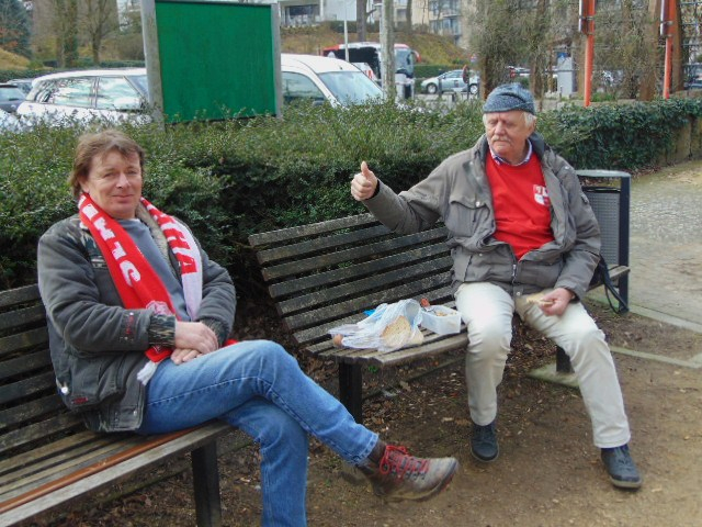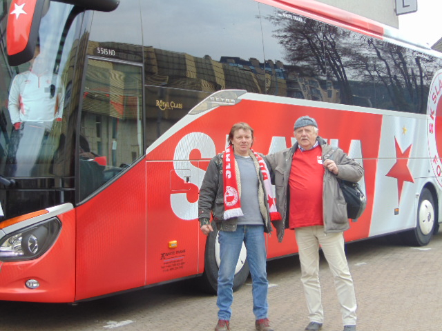 Vyrazili jsme v e 20, 30 hod autubusem Pella. Doplnili nás slávisti z Volyně, Blatné, Krkonoš a pod. Po několika zastávkách jsme po desáté dorazili na místo. A do začátku utkání jsme si prošli bývalé hornické město. Památek zde moc není až velké obchodní centru, kostel, pár památníků, obrovskou knihovnu s čítárnou, hornické muzeum a nádherné parky, které jsou plné vodního ptactva. Vedle parku byl hotel ve kterém spali fotbalisté Slavie. Při odchodu z hotelu jsme si s nimi potřásli rukou a popřáli, aby se dařilo. Potom jsme šli ho města na náměstí, které bylo plné stánků, jelikož zde probíhaly trhy. Slávisty se to všude hemžilo a obsadili téměř všechny hospody. My jsme byli v perfektní sportovní hospůdce se skvělým personálem, který nám i pivo v ceně 3 Eu prodával pouze za 2 Eu.